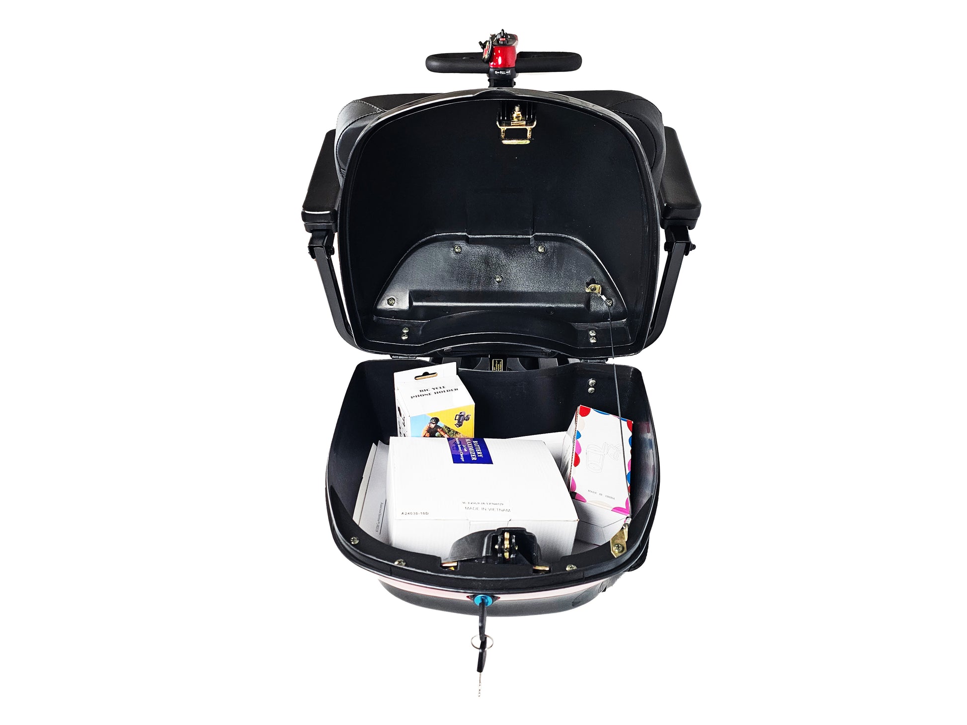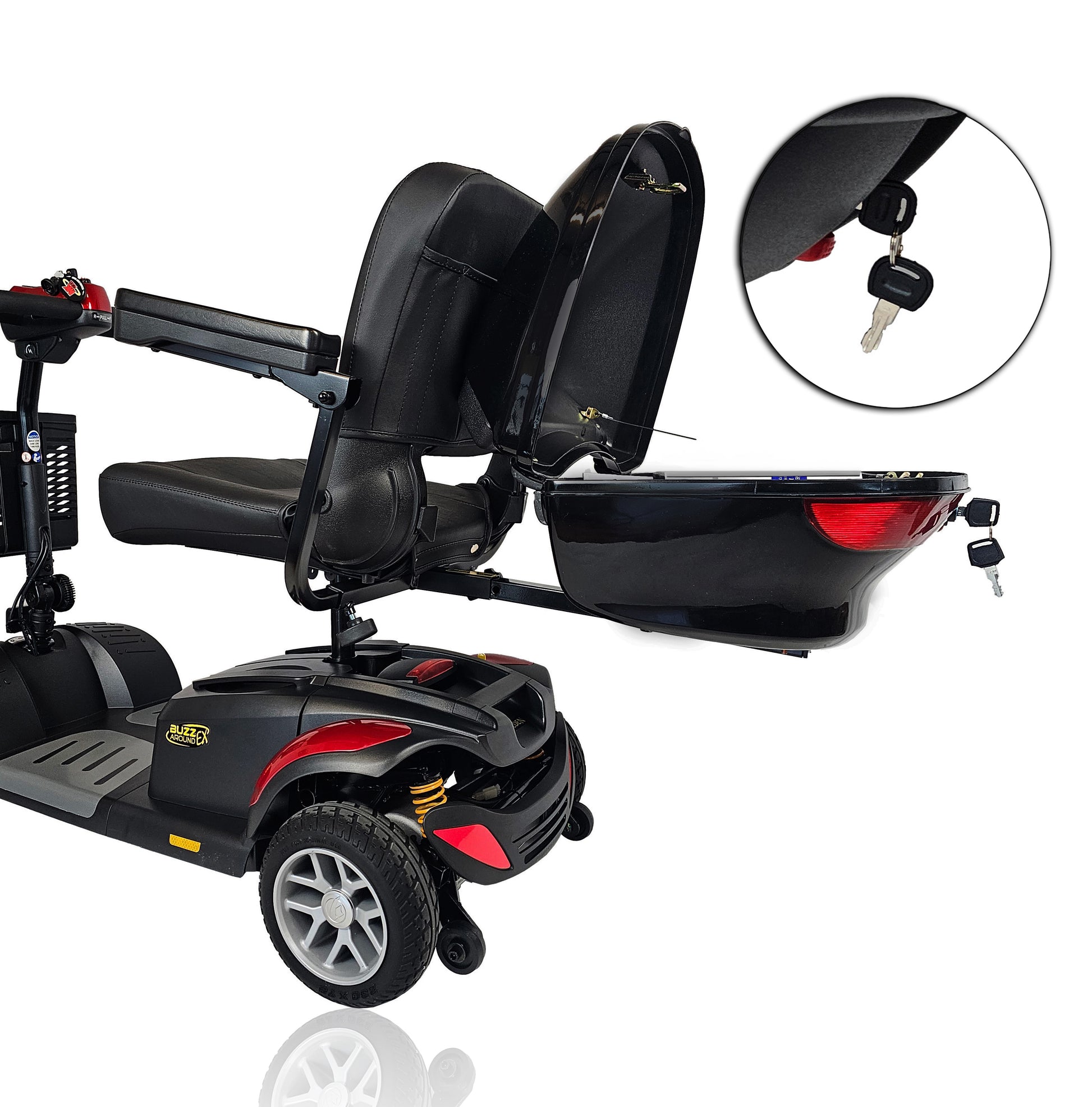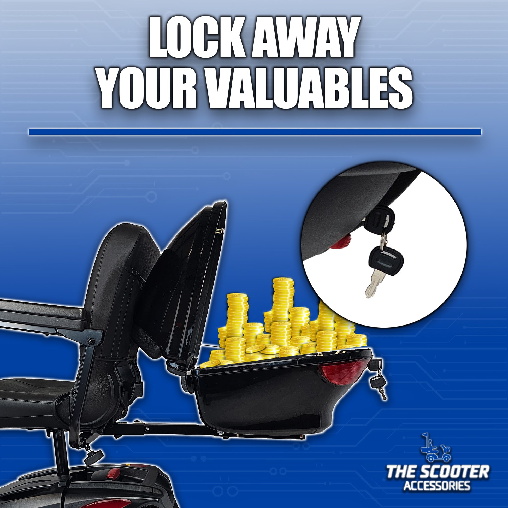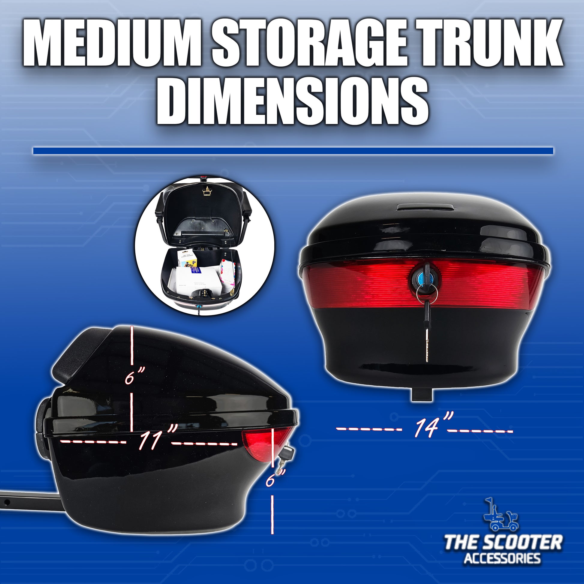 Keep your personal belongings secure, dry, and out of sight with the Standard Scooter Storage Trunk by The Scooter Accessories. Designed for mobility scooters and power chairs with a universal accessory hitch, this lockable rear trunk offers peace of mind on the go. Constructed from durable ABS plastic known for its impact resistance and weather protection, it’s built to handle everyday use. A glossy black finish and built-in safety reflectors add both style and visibility. Includes two keys and all mounting hardware for quick and easy installation.